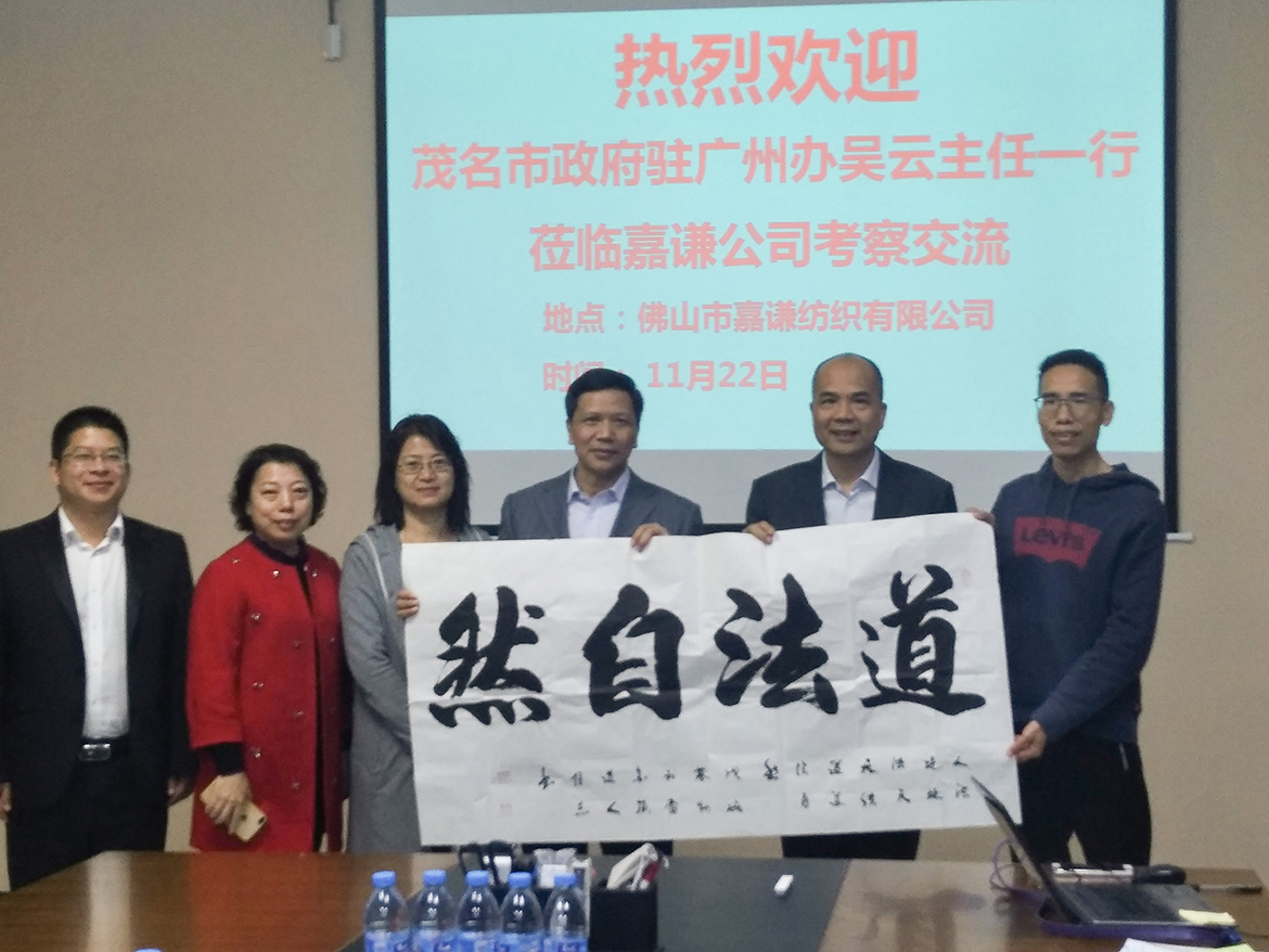 2018年11月22日下午佛山市嘉謙紡織有限公司迎來了茂名市政府駐廣州辦事處主任吳云一行進(jìn)行考察指導(dǎo)。嘉謙公司董事長兼廣東省茂名商會(huì)常務(wù)會(huì)長蔡景輝、財(cái)務(wù)總監(jiān)魏文穗表示熱烈歡迎應(yīng)并接待陪同。
